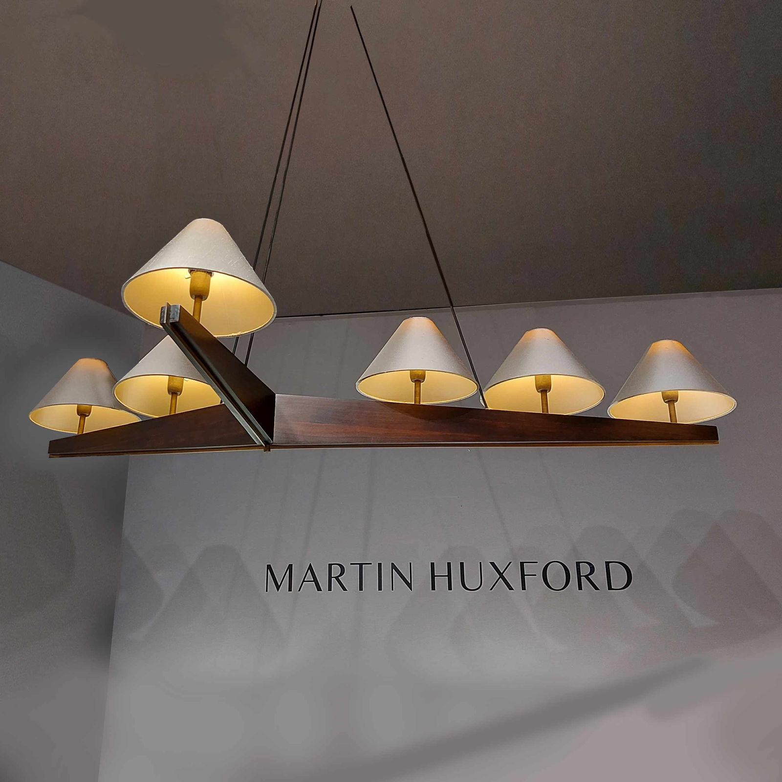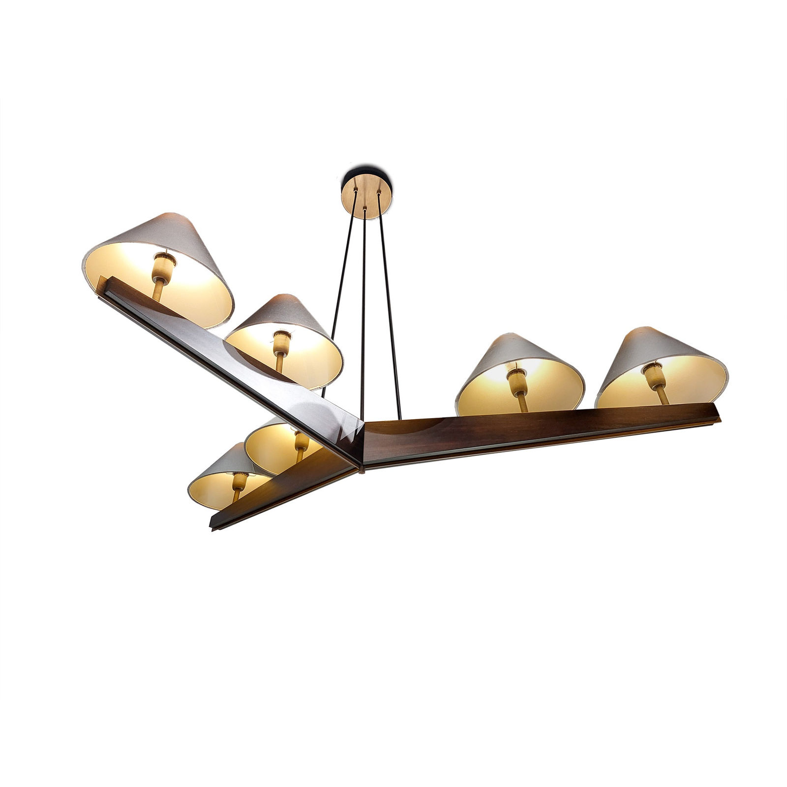 The Glide is a serene geometric chandelier, handmade in natural walnut wood with patinated brass accents, and a top display of shades. This harmonious light creates the perfect ambience for drawing rooms, dining rooms and libraries.