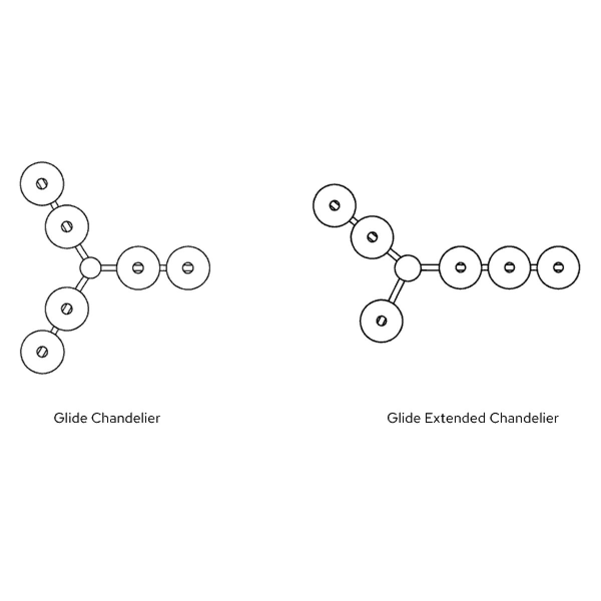 The Glide is designed in two geometric shapes. As a symmetrical chandelier, and as an asymmetric chandelier, with an extended arm which reaches out to create a feature light for dining tables or hallways.